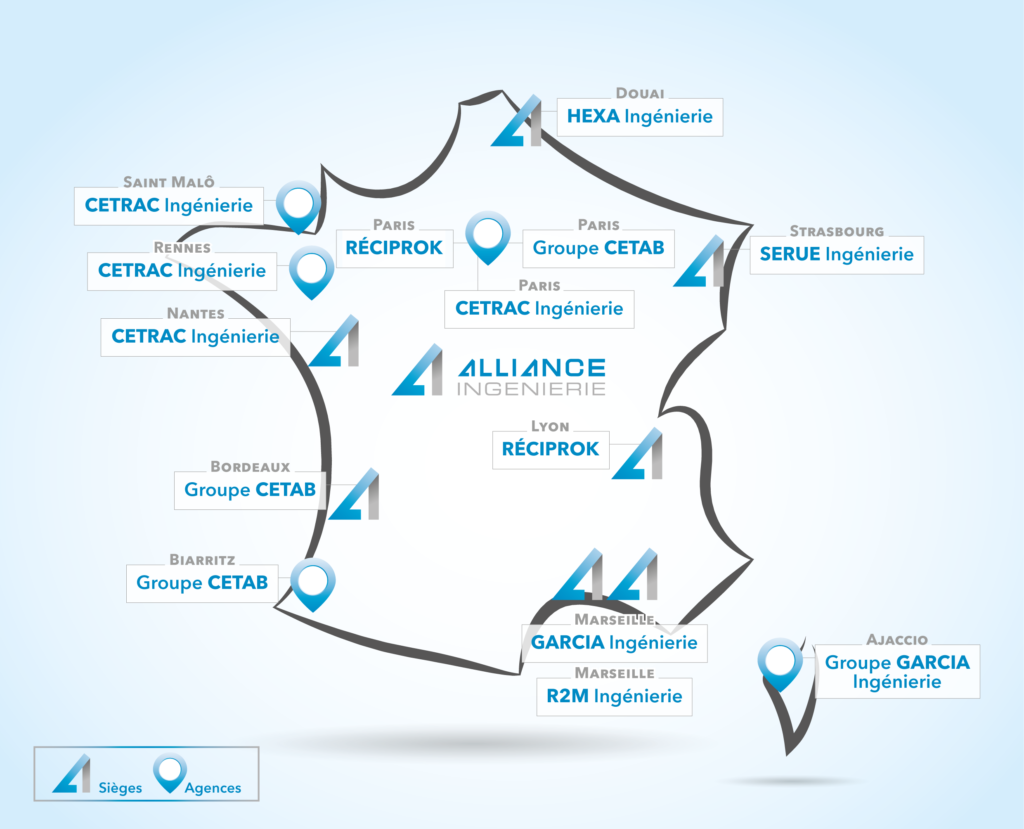 Aujourd’hui, nous sommes cinq bureaux d’études régionaux et indépendants, unis comme les cinq doigts de la main. Comme vous pouvez le voir sur la carte, nos sièges et nos agences sont implantés tout autour de l’hexagone, mais nous exerçons partout en France métropolitaine, aussi bien en Corse que dans la Principauté de Monaco.